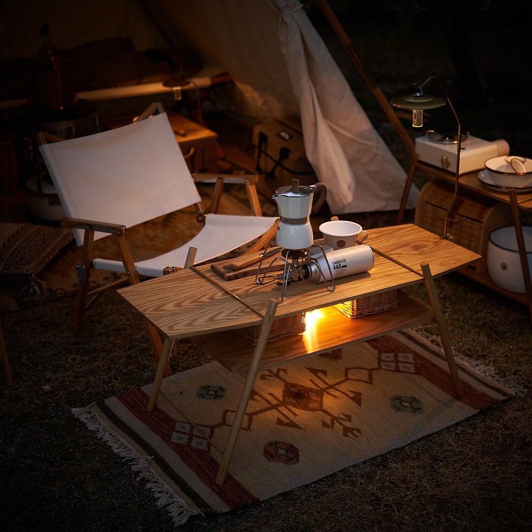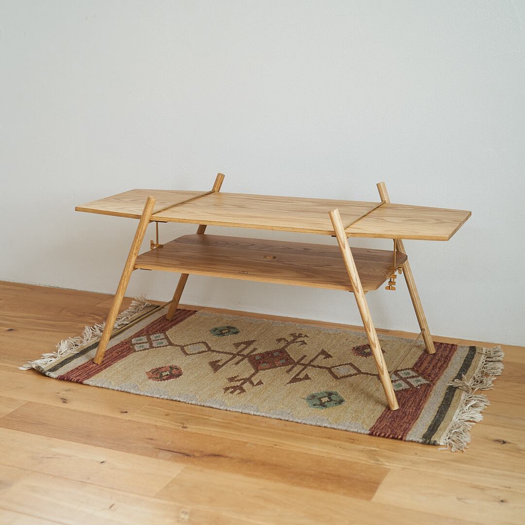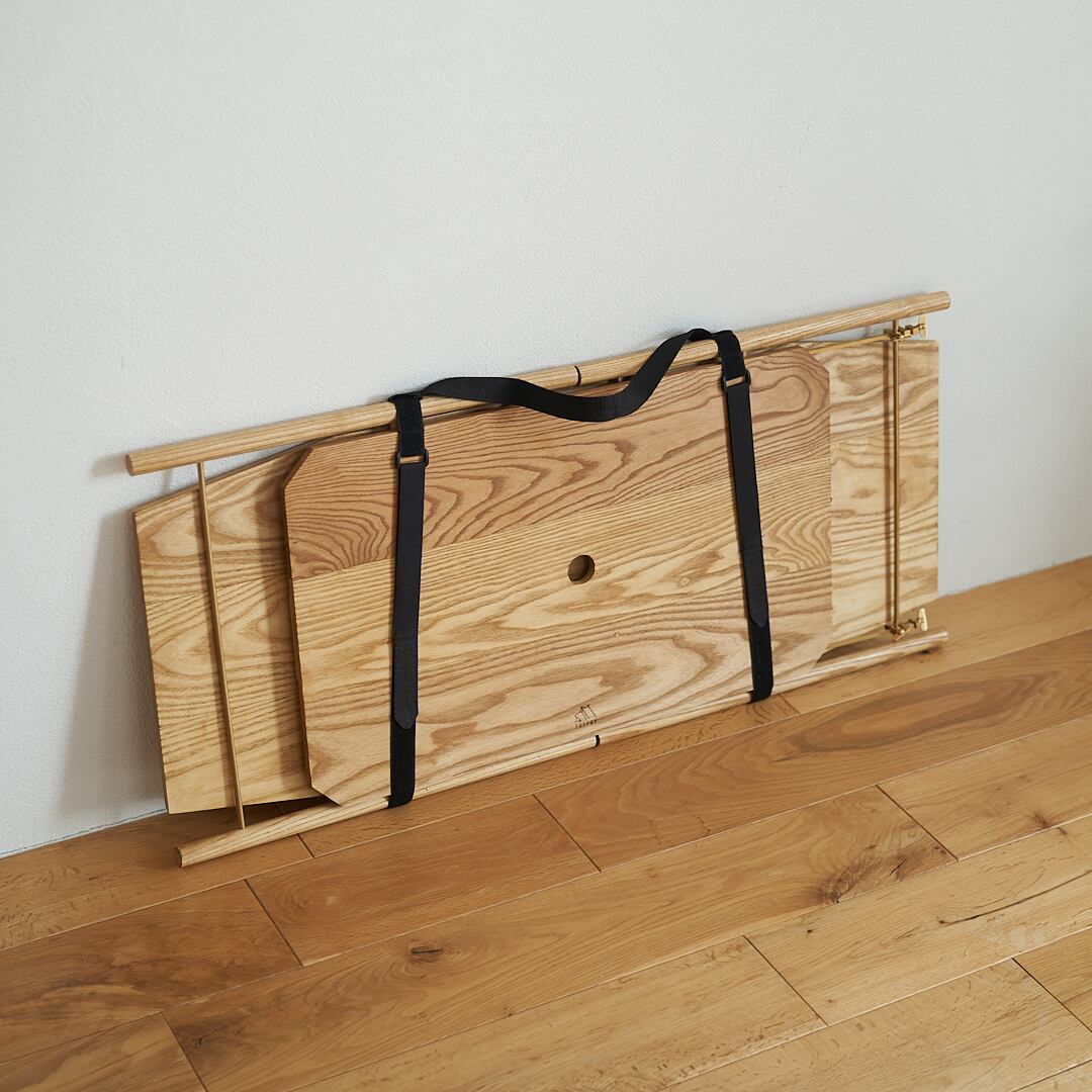 ホワイトアッシュという強度のある木材に真鍮をアクセントにあしらったキャンプローテーブル。組み立て式なのでコンパクトに持ち運べてキャンプでピッタリ。シンプルなデザインなので家で使ってもインテリアに馴染みます。