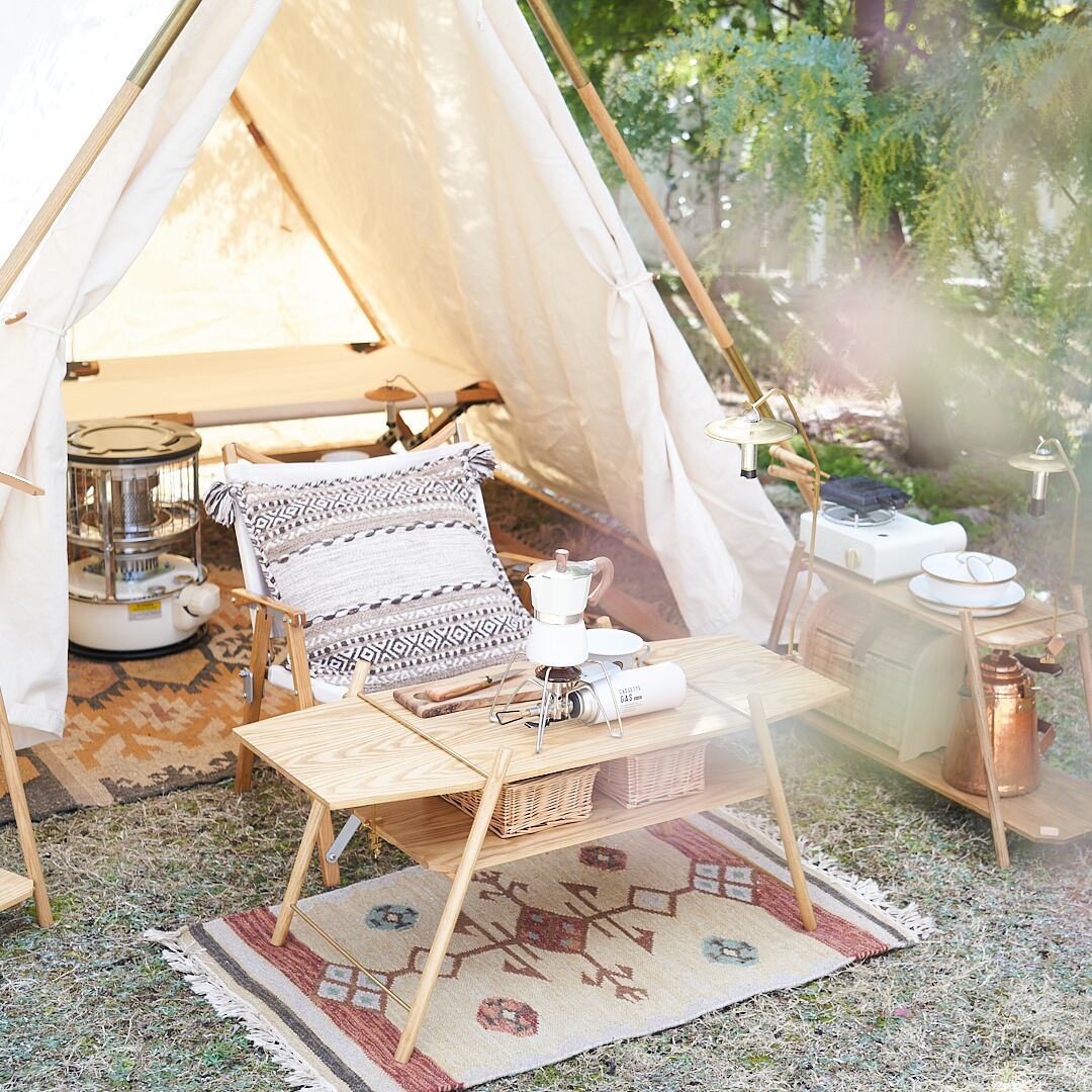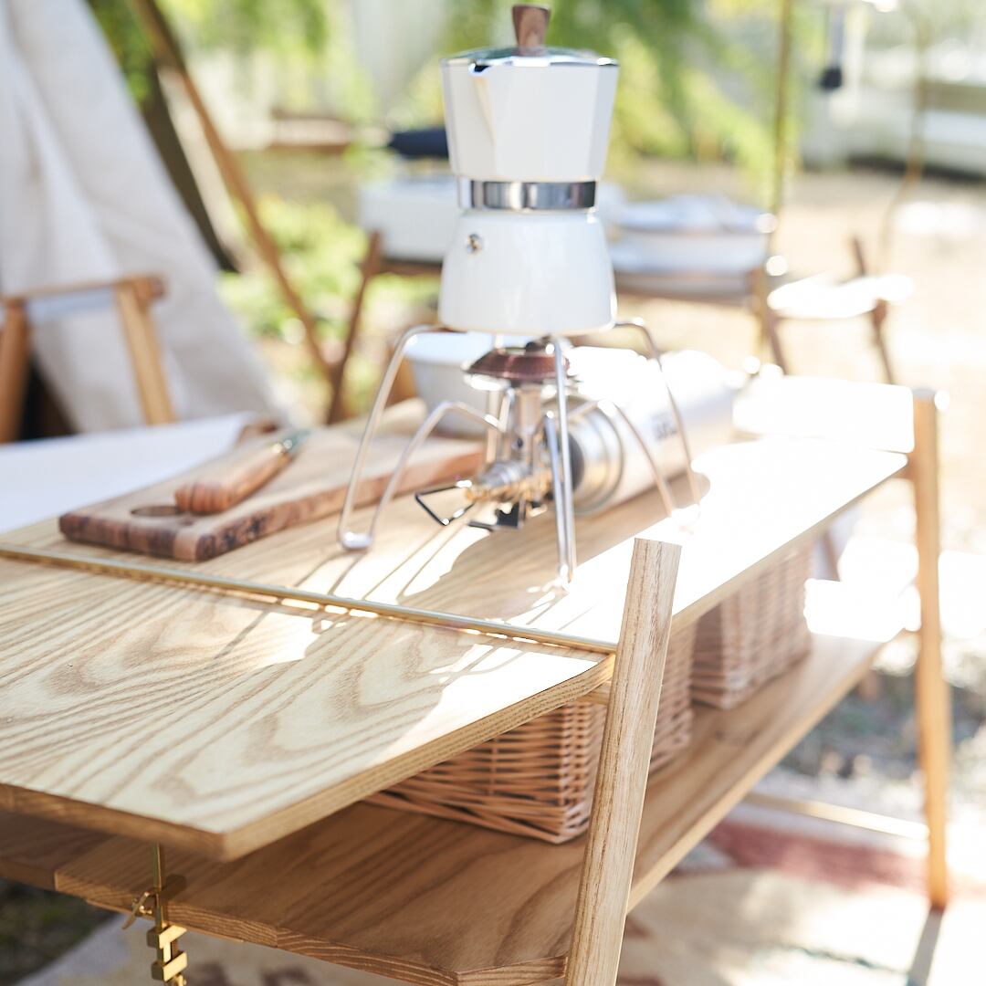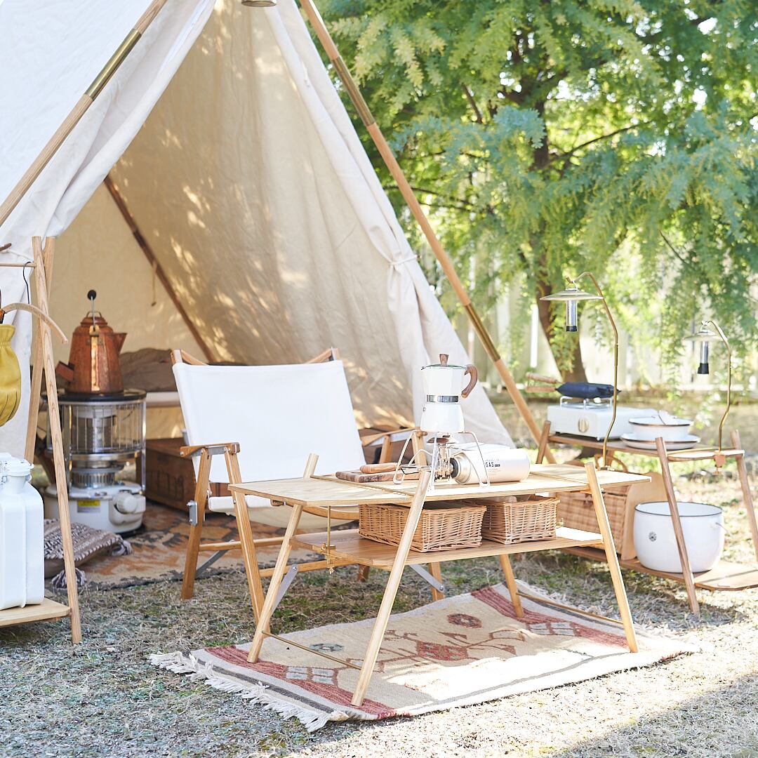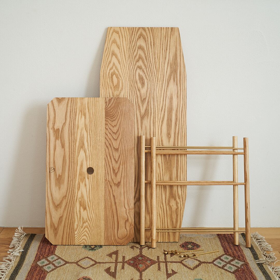 ホワイトアッシュという強度のある木材に真鍮をアクセントにあしらったキャンプローテーブル。組み立て式なのでコンパクトに持ち運べてキャンプでピッタリ。シンプルなデザインなので家で使ってもインテリアに馴染みます。